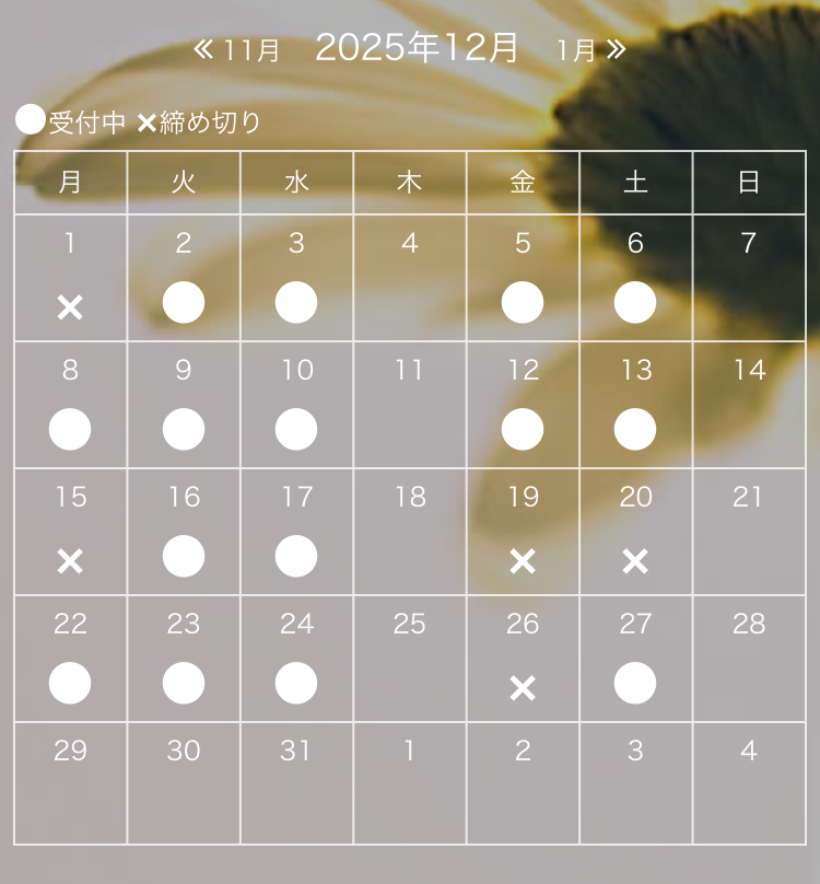 ※ご希望時間が予約フォームに無い場合、メールもしくは公式LINEアカウントへご相談くださいませ。
